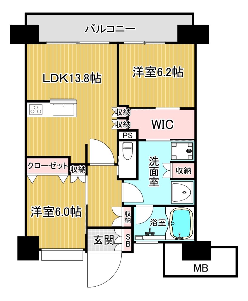 間取内容 LDK 13.8畳  洋室 6.2畳  洋室 6.0畳